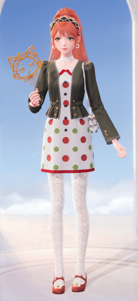 In order to make this outfit, I paired the dot dance dress with the golden elegance jacket, the morning departure hair, heartfelt touch socks and shining journey shoes.